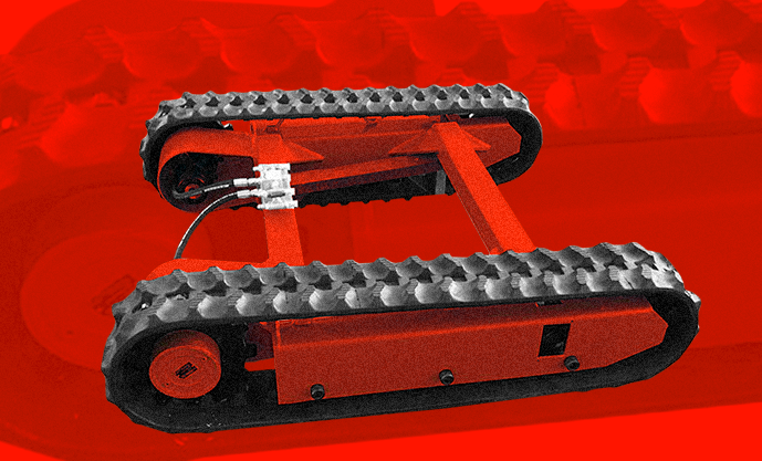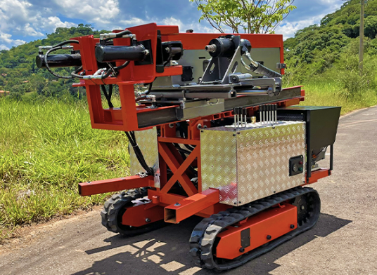 Se monta sobre un chasis con orugas de goma (“truck de esteiras de borracha”) para facilitar su traslado y posicionamiento en obra. Este diseño autopropulsado permite al equipo moverse por sí mismo dentro del espacio de trabajo.