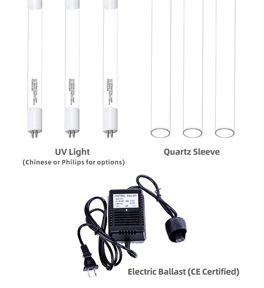 Incluye lámpara UV de cuarzo, tubo protector y fuente de alimentación.